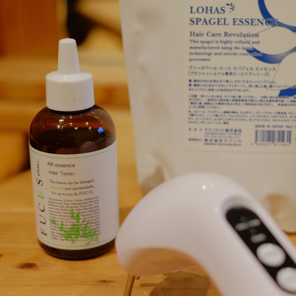 全メニューに、プロ専用の育毛エステ機器ヘアグローを使用した、トニックケアマッサージがついています。EMSの低周波機能により頭皮の硬化と糖化を防止。リンパの流れを良くし、イオン導入とバイブレーションで育毛エッセンスを毛根部まで浸透させます。その浸透力は、通常塗布の約30倍にもなります。当店の特許技術、酢酸ケアのヘッドスパとの組み合わせによりその効果はさらに上がります。クレンジングによる、老廃物、油分除去から酢酸シャンプーで頭皮洗浄、酢酸トリートメントで保湿後にヘアグローマッサージ。理にかなったスパ技術で、究極のヘアエステを受けて頂けます。